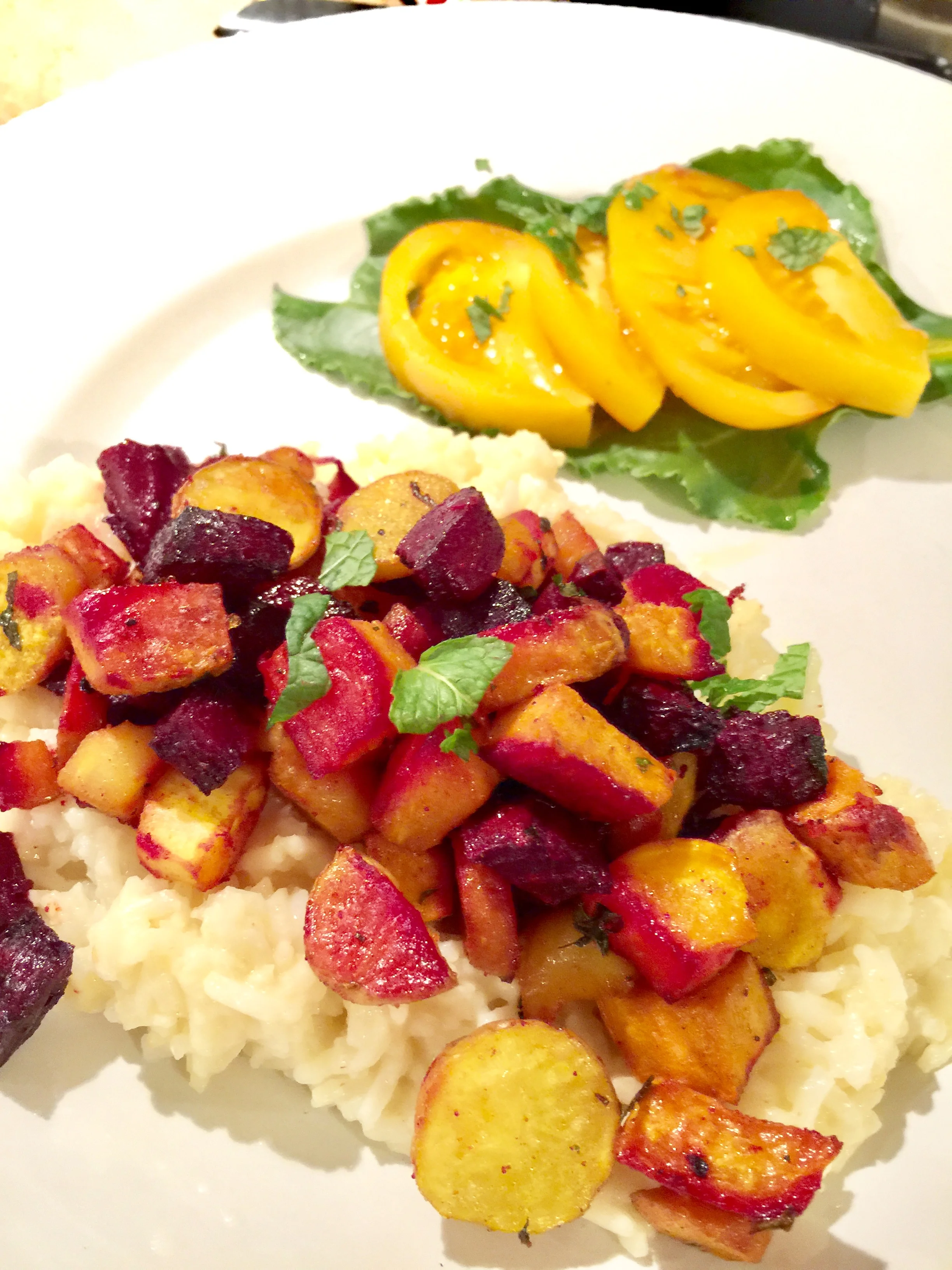On a large plate, create a bed of rice and top with the roasted root veggies and some chopped fresh herbs. Pour yourself another glass of wine and get ready to ignite your taste buds. This is one of those feel good meals.